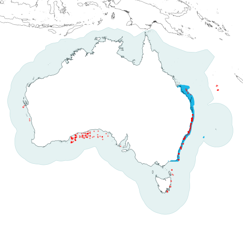 Occurrence locations [709] shown as red circles - View CSIRO Catch records Get expert distribution shapefile