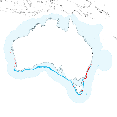 Occurrence locations [371] shown as red circles - View CSIRO Catch records Get expert distribution shapefile