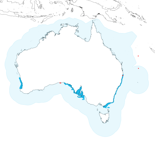 Occurrence locations [6] shown as red circles - View CSIRO Catch records Get expert distribution shapefile