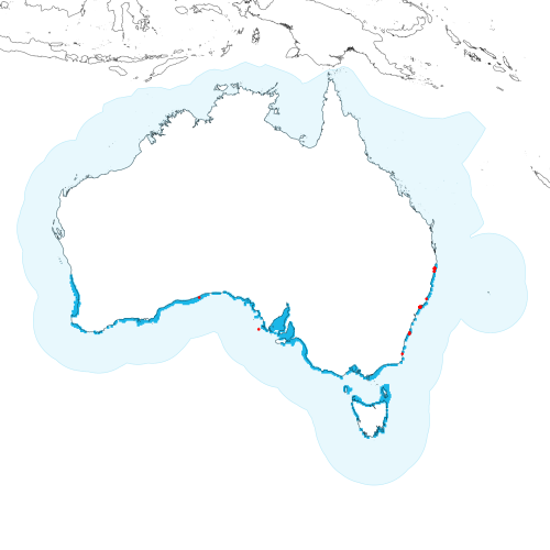 Occurrence locations [30] shown as red circles - View CSIRO Catch records Get expert distribution shapefile