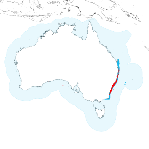 View detailed map or click on map to see same. ![]() Modelled distribution shown as blue polygon (source: Australian National Fish Expert Distributions) Updated on 2008-11-19. Occurrence locations [564] shown as red circles - View CSIRO Catch records Get expert distribution shapefile |