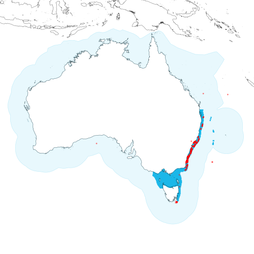 View detailed map or click on map to see same. ![]() Modelled distribution shown as blue polygon (source: Australian National Fish Expert Distributions) Updated on 2009-01-06. Occurrence locations [566] shown as red circles - View CSIRO Catch records Get expert distribution shapefile |