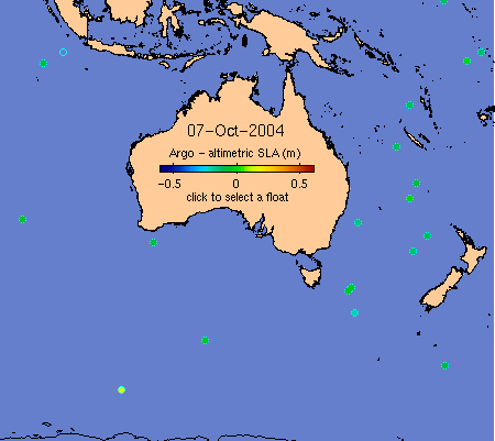 Click on the map below or choose a [WMO number] to see the temperature and salinity data from the selected float compared with satellite-adjusted climatology.