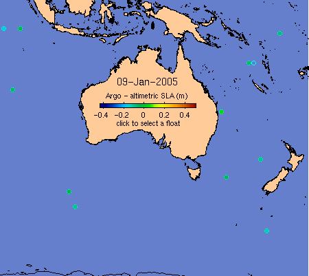 Click on the map below or choose a [WMO number] to see the temperature and salinity data from the selected float compared with satellite-adjusted climatology.
