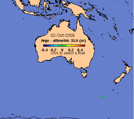 Click on the map below or choose a [WMO number] to see the temperature and salinity data from the selected float compared with satellite-adjusted climatology.