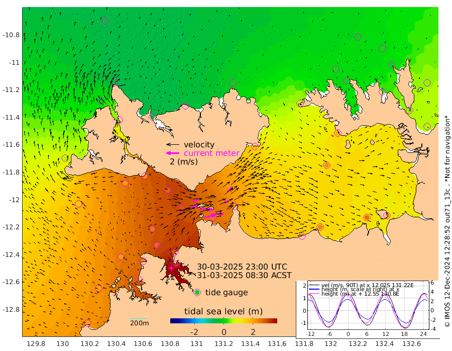 192cm/s 79T +4cm/s rms + 6cm/s 51T. Darwin_C1 52m 156cm/s 92T +4cm/s rms + 7cm/s -161T. Darwin_CW1 22m 120cm/s 71T +4cm/s rms + 8cm/s 61T. Darwin_CW2 34m 115cm/s 45T +3cm/s rms + 9cm/s 98T. Darwin_CW3 22m 199cm/s 89T +5cm/s rms + 7cm/s 88T. Darwin_C3 56m 93cm/s 65T +2cm/s rms + 9cm/s -126T. Darwin_CTbW 22m 12cm/s -15T +1cm/s rms + 1cm/s -47T. DARBGF 30m 26cm/s -34T +4cm/s rms + 3cm/s 80T. NRSDAR 19m -41cm Goodrich Bank 197cm Point Jenny 193cm Native Point 210cm Fish Reef 235cm Tapa Bay 65cm Point Fawcett (Offshore) 259cm Burge Point 209cm Munkunuwa 153cm Beagle A 260cm Parsons Bank 244cm Fenton Patches 271cm Hancox Shoal Area 273cm Nightcliff 295cm Darwin 256cm Charles Point Patches 237cm Glyde Point 230cm Chambers Bay 228cm Point Stuart 216cm Cape Hotham 215cm Christine Reef 249cm West Alligator Head 246cm East Field Island 188cm Two Hills Bay 187cm Camp Point 225cm Medina Inlet South 43cm South Barlow Point 7cm St. Asaph Bay -39cm Cape Van Dieman -33cm Snake Bay -28cm Cache Point 4cm Point Jahleel (Off) 82cm Cape Don 18cm Port Essington 18cm Smith Point - West 16cm NW Peacock Island -10cm North Of Jones Shoal -1cm Peacock Island 54cm Point David 24cm D'urville Point 61cm Copeland Island 49cm One Tree Point