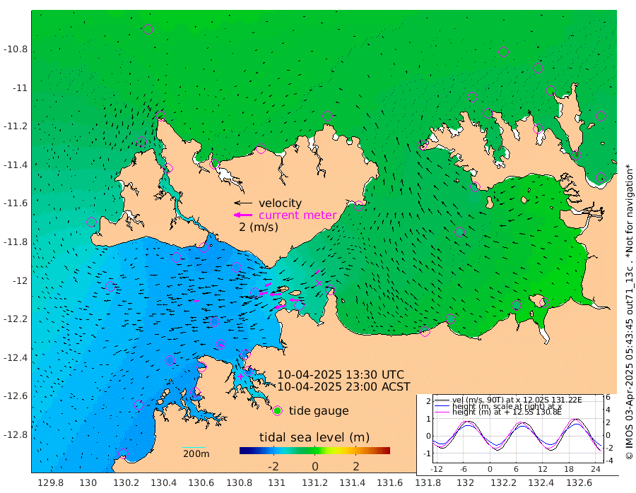 132cm/s -101T +4cm/s rms + 6cm/s 51T. Darwin_C1 52m 110cm/s -90T +4cm/s rms + 7cm/s -161T. Darwin_CW1 22m 87cm/s -107T +4cm/s rms + 8cm/s 61T. Darwin_CW2 34m 56cm/s -134T +3cm/s rms + 9cm/s 98T. Darwin_CW3 22m 122cm/s -91T +5cm/s rms + 7cm/s 88T. Darwin_C3 56m 74cm/s -115T +2cm/s rms + 9cm/s -126T. Darwin_CTbW 22m 49cm/s -93T +1cm/s rms + 1cm/s -47T. DARBGF 30m 43cm/s -64T +4cm/s rms + 3cm/s 80T. NRSDAR 19m -16cm Goodrich Bank -181cm Point Jenny -179cm Native Point -203cm Fish Reef -196cm Tapa Bay -112cm Point Fawcett (Offshore) -215cm Burge Point -191cm Munkunuwa -173cm Beagle A -201cm Parsons Bank -212cm Fenton Patches -191cm Hancox Shoal Area -212cm Nightcliff -220cm Darwin -205cm Charles Point Patches -146cm Glyde Point -91cm Chambers Bay -81cm Point Stuart -119cm Cape Hotham -81cm Christine Reef -82cm West Alligator Head -61cm East Field Island -86cm Two Hills Bay -82cm Camp Point -198cm Medina Inlet South -93cm South Barlow Point -67cm St. Asaph Bay -22cm Cape Van Dieman -26cm Snake Bay -26cm Cache Point -36cm Point Jahleel (Off) -68cm Cape Don -41cm Port Essington -43cm Smith Point - West -35cm NW Peacock Island -27cm North Of Jones Shoal -11cm Peacock Island -38cm Point David -43cm D'urville Point -40cm Copeland Island -42cm One Tree Point