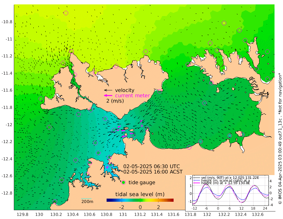 142cm/s -101T +4cm/s rms + 6cm/s 51T. Darwin_C1 52m 92cm/s -90T +4cm/s rms + 7cm/s -161T. Darwin_CW1 22m 56cm/s -107T +4cm/s rms + 8cm/s 61T. Darwin_CW2 34m 69cm/s -134T +3cm/s rms + 9cm/s 98T. Darwin_CW3 22m 87cm/s -91T +5cm/s rms + 7cm/s 88T. Darwin_C3 56m 78cm/s -116T +2cm/s rms + 9cm/s -126T. Darwin_CTbW 22m 4cm/s 177T +1cm/s rms + 1cm/s -47T. DARBGF 30m 9cm/s -165T +4cm/s rms + 3cm/s 80T. NRSDAR 19m 80cm Goodrich Bank -47cm Point Jenny -44cm Native Point -62cm Fish Reef -67cm Tapa Bay 26cm Point Fawcett (Offshore) -77cm Burge Point -75cm Munkunuwa -20cm Beagle A -97cm Parsons Bank -72cm Fenton Patches -94cm Hancox Shoal Area -89cm Nightcliff -99cm Darwin -66cm Charles Point Patches -80cm Glyde Point -83cm Chambers Bay -95cm Point Stuart -78cm Cape Hotham -72cm Christine Reef -110cm West Alligator Head -104cm East Field Island -70cm Two Hills Bay -49cm Camp Point -66cm Medina Inlet South 33cm South Barlow Point 56cm St. Asaph Bay 78cm Cape Van Dieman 74cm Snake Bay 74cm Cache Point 49cm Point Jahleel (Off) 2cm Cape Don 39cm Port Essington 35cm Smith Point - West 38cm NW Peacock Island 59cm North Of Jones Shoal 18cm Peacock Island 11cm Point David 31cm D'urville Point 4cm Copeland Island 17cm One Tree Point