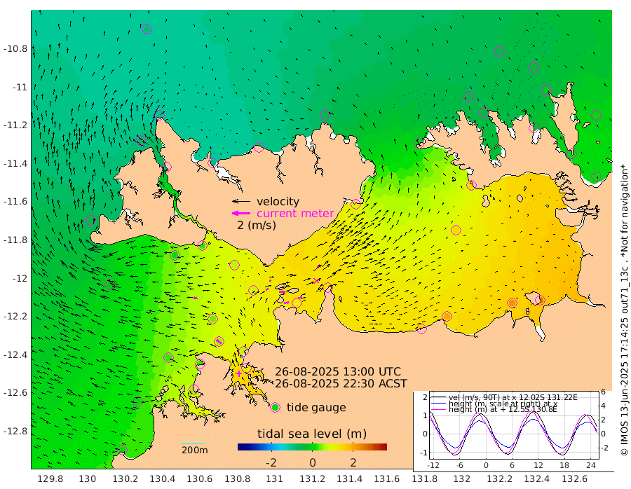 53cm/s 82T +4cm/s rms + 6cm/s 51T. Darwin_C1 52m 47cm/s 89T +4cm/s rms + 7cm/s -161T. Darwin_CW1 22m 29cm/s 70T +4cm/s rms + 8cm/s 61T. Darwin_CW2 34m 46cm/s 44T +3cm/s rms + 9cm/s 98T. Darwin_CW3 22m 67cm/s 91T +5cm/s rms + 7cm/s 88T. Darwin_C3 56m 20cm/s 67T +2cm/s rms + 9cm/s -126T. Darwin_CTbW 22m 50cm/s -81T +1cm/s rms + 1cm/s -47T. DARBGF 30m 68cm/s -52T +4cm/s rms + 3cm/s 80T. NRSDAR 19m -87cm Goodrich Bank 7cm Point Jenny 1cm Native Point 26cm Fish Reef 29cm Tapa Bay -52cm Point Fawcett (Offshore) 48cm Burge Point 17cm Munkunuwa -21cm Beagle A 62cm Parsons Bank 35cm Fenton Patches 75cm Hancox Shoal Area 61cm Nightcliff 83cm Darwin 48cm Charles Point Patches 108cm Glyde Point 169cm Chambers Bay 193cm Point Stuart 128cm Cape Hotham 146cm Christine Reef 219cm West Alligator Head 243cm East Field Island 135cm Two Hills Bay 116cm Camp Point 31cm Medina Inlet South -68cm South Barlow Point -81cm St. Asaph Bay -90cm Cape Van Dieman -85cm Snake Bay -75cm Cache Point -47cm Point Jahleel (Off) 14cm Cape Don -35cm Port Essington -38cm Smith Point - West -34cm NW Peacock Island -48cm North Of Jones Shoal -14cm Peacock Island 6cm Point David -32cm D'urville Point 14cm Copeland Island 4cm One Tree Point