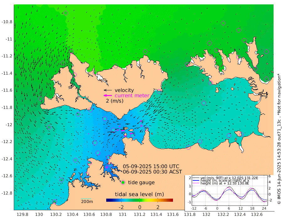 74cm/s -101T +4cm/s rms + 6cm/s 51T. Darwin_C1 52m 78cm/s -93T +4cm/s rms + 7cm/s -161T. Darwin_CW1 22m 45cm/s -105T +4cm/s rms + 8cm/s 61T. Darwin_CW2 34m 61cm/s -140T +3cm/s rms + 9cm/s 98T. Darwin_CW3 22m 84cm/s -90T +5cm/s rms + 7cm/s 88T. Darwin_C3 56m 36cm/s -116T +2cm/s rms + 9cm/s -126T. Darwin_CTbW 22m 12cm/s 121T +1cm/s rms + 1cm/s -47T. DARBGF 30m 17cm/s 141T +4cm/s rms + 3cm/s 80T. NRSDAR 19m 19cm Goodrich Bank -106cm Point Jenny -105cm Native Point -116cm Fish Reef -133cm Tapa Bay -35cm Point Fawcett (Offshore) -142cm Burge Point -105cm Munkunuwa -83cm Beagle A -138cm Parsons Bank -136cm Fenton Patches -151cm Hancox Shoal Area -152cm Nightcliff -173cm Darwin -155cm Charles Point Patches -146cm Glyde Point -151cm Chambers Bay -146cm Point Stuart -132cm Cape Hotham -127cm Christine Reef -157cm West Alligator Head -166cm East Field Island -115cm Two Hills Bay -129cm Camp Point -126cm Medina Inlet South -21cm South Barlow Point -2cm St. Asaph Bay 19cm Cape Van Dieman 13cm Snake Bay 13cm Cache Point -4cm Point Jahleel (Off) -51cm Cape Don -15cm Port Essington -8cm Smith Point - West -10cm NW Peacock Island 2cm North Of Jones Shoal -1cm Peacock Island -41cm Point David -13cm D'urville Point -44cm Copeland Island -37cm One Tree Point
