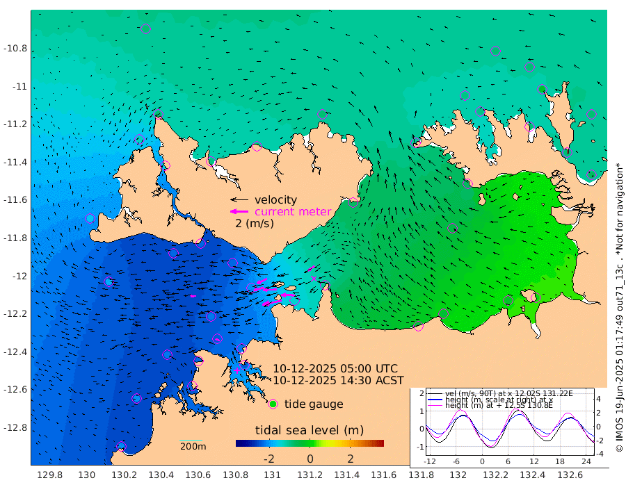221cm/s -102T +4cm/s rms + 6cm/s 51T. Darwin_C1 52m 156cm/s -89T +4cm/s rms + 7cm/s -161T. Darwin_CW1 22m 115cm/s -108T +4cm/s rms + 8cm/s 61T. Darwin_CW2 34m 91cm/s -127T +3cm/s rms + 9cm/s 98T. Darwin_CW3 22m 156cm/s -91T +5cm/s rms + 7cm/s 88T. Darwin_C3 56m 123cm/s -115T +2cm/s rms + 9cm/s -126T. Darwin_CTbW 22m 65cm/s -93T +1cm/s rms + 1cm/s -47T. DARBGF 30m 50cm/s -66T +4cm/s rms + 3cm/s 80T. NRSDAR 19m -82cm Goodrich Bank -210cm Point Jenny -212cm Native Point -221cm Fish Reef -229cm Tapa Bay -169cm Point Fawcett (Offshore) -231cm Burge Point -229cm Munkunuwa -190cm Beagle A -228cm Parsons Bank -215cm Fenton Patches -209cm Hancox Shoal Area -224cm Nightcliff -246cm Darwin -242cm Charles Point Patches -144cm Glyde Point -52cm Chambers Bay -40cm Point Stuart -104cm Cape Hotham -51cm Christine Reef -32cm West Alligator Head 8cm East Field Island -72cm Two Hills Bay -71cm Camp Point -235cm Medina Inlet South -156cm South Barlow Point -128cm St. Asaph Bay -89cm Cape Van Dieman -101cm Snake Bay -86cm Cache Point -87cm Point Jahleel (Off) -102cm Cape Don -92cm Port Essington -90cm Smith Point - West -83cm NW Peacock Island -82cm North Of Jones Shoal -29cm Peacock Island -81cm Point David -89cm D'urville Point -76cm Copeland Island -86cm One Tree Point