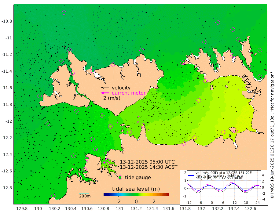 4cm/s 98T +4cm/s rms + 6cm/s 51T. Darwin_C1 52m 0cm/s 3T +4cm/s rms + 7cm/s -161T. Darwin_CW1 22m 6cm/s 85T +4cm/s rms + 8cm/s 61T. Darwin_CW2 34m 11cm/s 23T +3cm/s rms + 9cm/s 98T. Darwin_CW3 22m 18cm/s 92T +5cm/s rms + 7cm/s 88T. Darwin_C3 56m 1cm/s 104T +2cm/s rms + 9cm/s -126T. Darwin_CTbW 22m 13cm/s -81T +1cm/s rms + 1cm/s -47T. DARBGF 30m 16cm/s -52T +4cm/s rms + 3cm/s 80T. NRSDAR 19m -51cm Goodrich Bank 12cm Point Jenny 5cm Native Point 20cm Fish Reef 16cm Tapa Bay -20cm Point Fawcett (Offshore) 24cm Burge Point 6cm Munkunuwa -2cm Beagle A 26cm Parsons Bank 21cm Fenton Patches 35cm Hancox Shoal Area 31cm Nightcliff 31cm Darwin 16cm Charles Point Patches 51cm Glyde Point 91cm Chambers Bay 99cm Point Stuart 65cm Cape Hotham 74cm Christine Reef 112cm West Alligator Head 124cm East Field Island 68cm Two Hills Bay 54cm Camp Point 11cm Medina Inlet South -40cm South Barlow Point -41cm St. Asaph Bay -51cm Cape Van Dieman -54cm Snake Bay -40cm Cache Point -27cm Point Jahleel (Off) 5cm Cape Don -21cm Port Essington -21cm Smith Point - West -20cm NW Peacock Island -26cm North Of Jones Shoal -8cm Peacock Island -1cm Point David -19cm D'urville Point 5cm Copeland Island -2cm One Tree Point