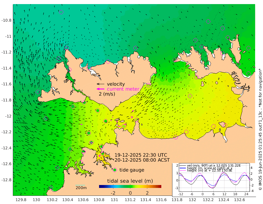 51cm/s 81T +4cm/s rms + 6cm/s 51T. Darwin_C1 52m 64cm/s 91T +4cm/s rms + 7cm/s -161T. Darwin_CW1 22m 18cm/s 59T +4cm/s rms + 8cm/s 61T. Darwin_CW2 34m 49cm/s 43T +3cm/s rms + 9cm/s 98T. Darwin_CW3 22m 40cm/s 91T +5cm/s rms + 7cm/s 88T. Darwin_C3 56m 16cm/s 66T +2cm/s rms + 9cm/s -126T. Darwin_CTbW 22m 42cm/s -84T +1cm/s rms + 1cm/s -47T. DARBGF 30m 55cm/s -55T +4cm/s rms + 3cm/s 80T. NRSDAR 19m -101cm Goodrich Bank -41cm Point Jenny -44cm Native Point -20cm Fish Reef -22cm Tapa Bay -85cm Point Fawcett (Offshore) -5cm Burge Point -23cm Munkunuwa -61cm Beagle A 12cm Parsons Bank -15cm Fenton Patches 17cm Hancox Shoal Area 7cm Nightcliff 28cm Darwin -2cm Charles Point Patches 48cm Glyde Point 85cm Chambers Bay 109cm Point Stuart 61cm Cape Hotham 65cm Christine Reef 124cm West Alligator Head 142cm East Field Island 66cm Two Hills Bay 57cm Camp Point -13cm Medina Inlet South -85cm South Barlow Point -101cm St. Asaph Bay -102cm Cape Van Dieman -94cm Snake Bay -95cm Cache Point -71cm Point Jahleel (Off) -19cm Cape Don -51cm Port Essington -58cm Smith Point - West -52cm NW Peacock Island -64cm North Of Jones Shoal -19cm Peacock Island -8cm Point David -48cm D'urville Point 0cm Copeland Island -11cm One Tree Point