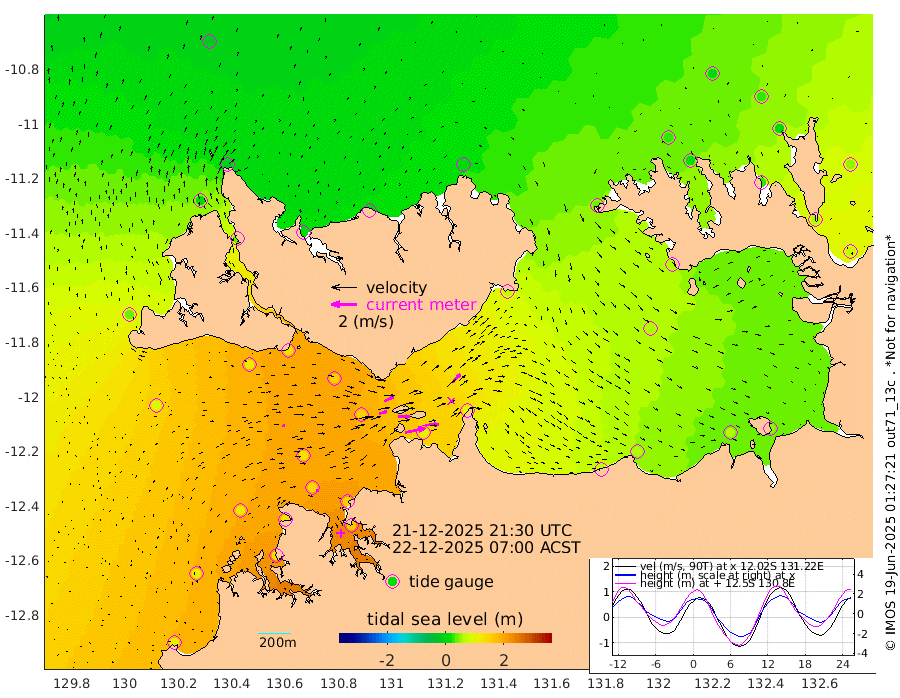 159cm/s 77T +4cm/s rms + 6cm/s 51T. Darwin_C1 52m 109cm/s 89T +4cm/s rms + 7cm/s -161T. Darwin_CW1 22m 61cm/s 74T +4cm/s rms + 8cm/s 61T. Darwin_CW2 34m 90cm/s 44T +3cm/s rms + 9cm/s 98T. Darwin_CW3 22m 88cm/s 89T +5cm/s rms + 7cm/s 88T. Darwin_C3 56m 81cm/s 65T +2cm/s rms + 9cm/s -126T. Darwin_CTbW 22m 20cm/s 84T +1cm/s rms + 1cm/s -47T. DARBGF 30m 21cm/s 101T +4cm/s rms + 3cm/s 80T. NRSDAR 19m -18cm Goodrich Bank 106cm Point Jenny 107cm Native Point 113cm Fish Reef 133cm Tapa Bay 40cm Point Fawcett (Offshore) 136cm Burge Point 123cm Munkunuwa 81cm Beagle A 150cm Parsons Bank 128cm Fenton Patches 148cm Hancox Shoal Area 153cm Nightcliff 164cm Darwin 143cm Charles Point Patches 110cm Glyde Point 68cm Chambers Bay 67cm Point Stuart 92cm Cape Hotham 60cm Christine Reef 67cm West Alligator Head 50cm East Field Island 66cm Two Hills Bay 71cm Camp Point 128cm Medina Inlet South 39cm South Barlow Point 10cm St. Asaph Bay -12cm Cape Van Dieman 1cm Snake Bay -13cm Cache Point 5cm Point Jahleel (Off) 44cm Cape Don 23cm Port Essington 21cm Smith Point - West 24cm NW Peacock Island 6cm North Of Jones Shoal 6cm Peacock Island 66cm Point David 32cm D'urville Point 68cm Copeland Island 55cm One Tree Point