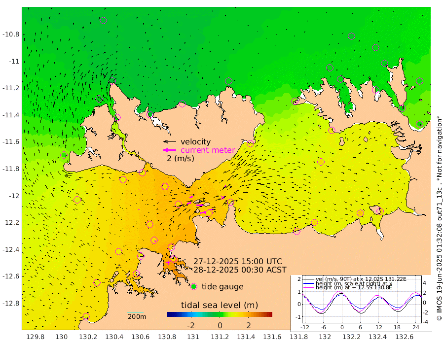 99cm/s 78T +4cm/s rms + 6cm/s 51T. Darwin_C1 52m 58cm/s 92T +4cm/s rms + 7cm/s -161T. Darwin_CW1 22m 65cm/s 71T +4cm/s rms + 8cm/s 61T. Darwin_CW2 34m 62cm/s 47T +3cm/s rms + 9cm/s 98T. Darwin_CW3 22m 104cm/s 90T +5cm/s rms + 7cm/s 88T. Darwin_C3 56m 54cm/s 65T +2cm/s rms + 9cm/s -126T. Darwin_CTbW 22m 11cm/s -48T +1cm/s rms + 1cm/s -47T. DARBGF 30m 21cm/s -38T +4cm/s rms + 3cm/s 80T. NRSDAR 19m -28cm Goodrich Bank 105cm Point Jenny 104cm Native Point 110cm Fish Reef 122cm Tapa Bay 26cm Point Fawcett (Offshore) 143cm Burge Point 108cm Munkunuwa 85cm Beagle A 138cm Parsons Bank 136cm Fenton Patches 141cm Hancox Shoal Area 153cm Nightcliff 157cm Darwin 126cm Charles Point Patches 137cm Glyde Point 146cm Chambers Bay 146cm Point Stuart 127cm Cape Hotham 136cm Christine Reef 162cm West Alligator Head 166cm East Field Island 118cm Two Hills Bay 115cm Camp Point 119cm Medina Inlet South 18cm South Barlow Point -5cm St. Asaph Bay -28cm Cape Van Dieman -19cm Snake Bay -22cm Cache Point -1cm Point Jahleel (Off) 47cm Cape Don 1cm Port Essington 1cm Smith Point - West 0cm NW Peacock Island -14cm North Of Jones Shoal -3cm Peacock Island 21cm Point David 4cm D'urville Point 22cm Copeland Island 20cm One Tree Point