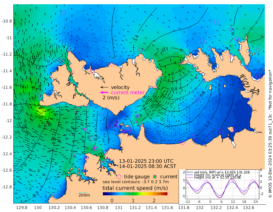 11cm/s 89T +4cm/s rms + 6cm/s 51T. Darwin_C1 52m 22cm/s 85T +4cm/s rms + 7cm/s -161T. Darwin_CW1 22m 5cm/s -57T +4cm/s rms + 8cm/s 61T. Darwin_CW2 34m 36cm/s 37T +3cm/s rms + 9cm/s 98T. Darwin_CW3 22m 2cm/s 128T +5cm/s rms + 7cm/s 88T. Darwin_C3 56m 4cm/s -113T +2cm/s rms + 9cm/s -126T. Darwin_CTbW 22m 59cm/s -86T +1cm/s rms + 1cm/s -47T. DARBGF 30m 68cm/s -55T +4cm/s rms + 3cm/s 80T. NRSDAR 19m -121cm Goodrich Bank -55cm Point Jenny -57cm Native Point -41cm Fish Reef -36cm Tapa Bay -119cm Point Fawcett (Offshore) -13cm Burge Point -43cm Munkunuwa -73cm Beagle A 1cm Parsons Bank -18cm Fenton Patches 12cm Hancox Shoal Area -8cm Nightcliff 13cm Darwin -21cm Charles Point Patches 48cm Glyde Point 103cm Chambers Bay 128cm Point Stuart 65cm Cape Hotham 87cm Christine Reef 146cm West Alligator Head 174cm East Field Island 70cm Two Hills Bay 68cm Camp Point -38cm Medina Inlet South -115cm South Barlow Point -129cm St. Asaph Bay -123cm Cape Van Dieman -121cm Snake Bay -116cm Cache Point -89cm Point Jahleel (Off) -33cm Cape Don -70cm Port Essington -75cm Smith Point - West -66cm NW Peacock Island -92cm North Of Jones Shoal -29cm Peacock Island -18cm Point David -63cm D'urville Point -8cm Copeland Island -29cm One Tree Point