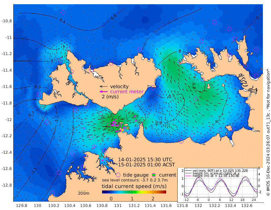 171cm/s -101T +4cm/s rms + 6cm/s 51T. Darwin_C1 52m 129cm/s -90T +4cm/s rms + 7cm/s -161T. Darwin_CW1 22m 75cm/s -107T +4cm/s rms + 8cm/s 61T. Darwin_CW2 34m 74cm/s -134T +3cm/s rms + 9cm/s 98T. Darwin_CW3 22m 100cm/s -91T +5cm/s rms + 7cm/s 88T. Darwin_C3 56m 94cm/s -116T +2cm/s rms + 9cm/s -126T. Darwin_CTbW 22m 35cm/s -93T +1cm/s rms + 1cm/s -47T. DARBGF 30m 34cm/s -69T +4cm/s rms + 3cm/s 80T. NRSDAR 19m 47cm Goodrich Bank -112cm Point Jenny -109cm Native Point -130cm Fish Reef -131cm Tapa Bay -34cm Point Fawcett (Offshore) -143cm Burge Point -140cm Munkunuwa -92cm Beagle A -148cm Parsons Bank -140cm Fenton Patches -139cm Hancox Shoal Area -146cm Nightcliff -154cm Darwin -130cm Charles Point Patches -97cm Glyde Point -54cm Chambers Bay -54cm Point Stuart -77cm Cape Hotham -45cm Christine Reef -58cm West Alligator Head -38cm East Field Island -49cm Two Hills Bay -39cm Camp Point -130cm Medina Inlet South -23cm South Barlow Point 4cm St. Asaph Bay 41cm Cape Van Dieman 39cm Snake Bay 40cm Cache Point 23cm Point Jahleel (Off) -14cm Cape Don 14cm Port Essington 10cm Smith Point - West 17cm NW Peacock Island 35cm North Of Jones Shoal 10cm Peacock Island 0cm Point David 8cm D'urville Point -5cm Copeland Island 5cm One Tree Point