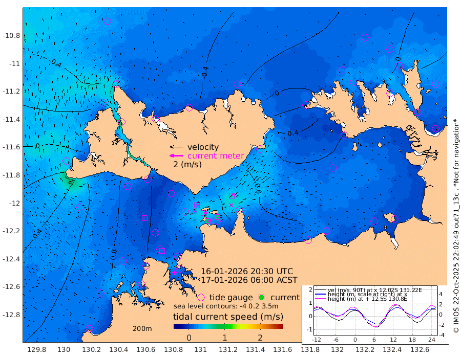 68cm/s 79T +4cm/s rms + 6cm/s 51T. Darwin_C1 52m 68cm/s 92T +4cm/s rms + 7cm/s -161T. Darwin_CW1 22m 28cm/s 68T +4cm/s rms + 8cm/s 61T. Darwin_CW2 34m 50cm/s 40T +3cm/s rms + 9cm/s 98T. Darwin_CW3 22m 49cm/s 90T +5cm/s rms + 7cm/s 88T. Darwin_C3 56m 28cm/s 66T +2cm/s rms + 9cm/s -126T. Darwin_CTbW 22m 10cm/s -75T +1cm/s rms + 1cm/s -47T. DARBGF 30m 13cm/s -49T +4cm/s rms + 3cm/s 80T. NRSDAR 19m -58cm Goodrich Bank 18cm Point Jenny 16cm Native Point 35cm Fish Reef 35cm Tapa Bay -24cm Point Fawcett (Offshore) 46cm Burge Point 30cm Munkunuwa 3cm Beagle A 54cm Parsons Bank 40cm Fenton Patches 56cm Hancox Shoal Area 57cm Nightcliff 69cm Darwin 48cm Charles Point Patches 61cm Glyde Point 65cm Chambers Bay 77cm Point Stuart 63cm Cape Hotham 49cm Christine Reef 84cm West Alligator Head 88cm East Field Island 55cm Two Hills Bay 53cm Camp Point 39cm Medina Inlet South -28cm South Barlow Point -46cm St. Asaph Bay -56cm Cape Van Dieman -48cm Snake Bay -52cm Cache Point -35cm Point Jahleel (Off) 6cm Cape Don -18cm Port Essington -24cm Smith Point - West -20cm NW Peacock Island -30cm North Of Jones Shoal -7cm Peacock Island 16cm Point David -15cm D'urville Point 21cm Copeland Island 12cm One Tree Point