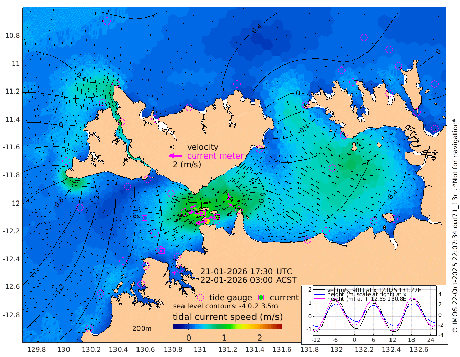 169cm/s -101T +4cm/s rms + 6cm/s 51T. Darwin_C1 52m 122cm/s -91T +4cm/s rms + 7cm/s -161T. Darwin_CW1 22m 83cm/s -107T +4cm/s rms + 8cm/s 61T. Darwin_CW2 34m 87cm/s -136T +3cm/s rms + 9cm/s 98T. Darwin_CW3 22m 126cm/s -91T +5cm/s rms + 7cm/s 88T. Darwin_C3 56m 94cm/s -115T +2cm/s rms + 9cm/s -126T. Darwin_CTbW 22m 16cm/s -108T +1cm/s rms + 1cm/s -47T. DARBGF 30m 14cm/s -103T +4cm/s rms + 3cm/s 80T. NRSDAR 19m 54cm Goodrich Bank -125cm Point Jenny -123cm Native Point -138cm Fish Reef -154cm Tapa Bay -28cm Point Fawcett (Offshore) -169cm Burge Point -150cm Munkunuwa -99cm Beagle A -175cm Parsons Bank -165cm Fenton Patches -178cm Hancox Shoal Area -194cm Nightcliff -193cm Darwin -157cm Charles Point Patches -141cm Glyde Point -125cm Chambers Bay -116cm Point Stuart -125cm Cape Hotham -110cm Christine Reef -129cm West Alligator Head -119cm East Field Island -97cm Two Hills Bay -93cm Camp Point -150cm Medina Inlet South -19cm South Barlow Point 11cm St. Asaph Bay 51cm Cape Van Dieman 42cm Snake Bay 48cm Cache Point 20cm Point Jahleel (Off) -28cm Cape Don 17cm Port Essington 12cm Smith Point - West 16cm NW Peacock Island 32cm North Of Jones Shoal 9cm Peacock Island -9cm Point David 9cm D'urville Point -15cm Copeland Island -5cm One Tree Point