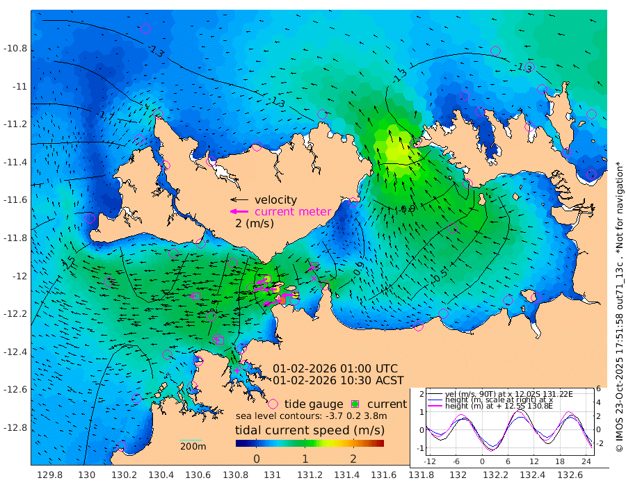 213cm/s -102T +4cm/s rms + 6cm/s 51T. Darwin_C1 52m 152cm/s -89T +4cm/s rms + 7cm/s -161T. Darwin_CW1 22m 112cm/s -107T +4cm/s rms + 8cm/s 61T. Darwin_CW2 34m 86cm/s -129T +3cm/s rms + 9cm/s 98T. Darwin_CW3 22m 145cm/s -91T +5cm/s rms + 7cm/s 88T. Darwin_C3 56m 129cm/s -115T +2cm/s rms + 9cm/s -126T. Darwin_CTbW 22m 76cm/s -92T +1cm/s rms + 1cm/s -47T. DARBGF 30m 64cm/s -62T +4cm/s rms + 3cm/s 80T. NRSDAR 19m -98cm Goodrich Bank -261cm Point Jenny -259cm Native Point -267cm Fish Reef -270cm Tapa Bay -206cm Point Fawcett (Offshore) -278cm Burge Point -256cm Munkunuwa -245cm Beagle A -257cm Parsons Bank -267cm Fenton Patches -242cm Hancox Shoal Area -265cm Nightcliff -274cm Darwin -275cm Charles Point Patches -177cm Glyde Point -89cm Chambers Bay -73cm Point Stuart -137cm Cape Hotham -90cm Christine Reef -66cm West Alligator Head -29cm East Field Island -101cm Two Hills Bay -101cm Camp Point -267cm Medina Inlet South -178cm South Barlow Point -154cm St. Asaph Bay -107cm Cape Van Dieman -112cm Snake Bay -111cm Cache Point -108cm Point Jahleel (Off) -127cm Cape Don -111cm Port Essington -111cm Smith Point - West -102cm NW Peacock Island -99cm North Of Jones Shoal -35cm Peacock Island -96cm Point David -108cm D'urville Point -91cm Copeland Island -101cm One Tree Point