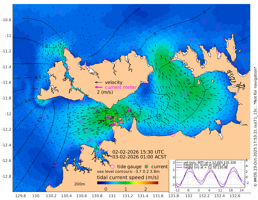 188cm/s -101T +4cm/s rms + 6cm/s 51T. Darwin_C1 52m 144cm/s -90T +4cm/s rms + 7cm/s -161T. Darwin_CW1 22m 93cm/s -107T +4cm/s rms + 8cm/s 61T. Darwin_CW2 34m 84cm/s -134T +3cm/s rms + 9cm/s 98T. Darwin_CW3 22m 124cm/s -91T +5cm/s rms + 7cm/s 88T. Darwin_C3 56m 106cm/s -115T +2cm/s rms + 9cm/s -126T. Darwin_CTbW 22m 43cm/s -94T +1cm/s rms + 1cm/s -47T. DARBGF 30m 40cm/s -69T +4cm/s rms + 3cm/s 80T. NRSDAR 19m 33cm Goodrich Bank -158cm Point Jenny -156cm Native Point -178cm Fish Reef -182cm Tapa Bay -64cm Point Fawcett (Offshore) -199cm Burge Point -185cm Munkunuwa -139cm Beagle A -199cm Parsons Bank -195cm Fenton Patches -188cm Hancox Shoal Area -200cm Nightcliff -210cm Darwin -183cm Charles Point Patches -137cm Glyde Point -83cm Chambers Bay -78cm Point Stuart -110cm Cape Hotham -73cm Christine Reef -83cm West Alligator Head -59cm East Field Island -74cm Two Hills Bay -68cm Camp Point -179cm Medina Inlet South -52cm South Barlow Point -19cm St. Asaph Bay 26cm Cape Van Dieman 22cm Snake Bay 24cm Cache Point 5cm Point Jahleel (Off) -37cm Cape Don -4cm Port Essington -8cm Smith Point - West -1cm NW Peacock Island 20cm North Of Jones Shoal 5cm Peacock Island -19cm Point David -11cm D'urville Point -24cm Copeland Island -13cm One Tree Point