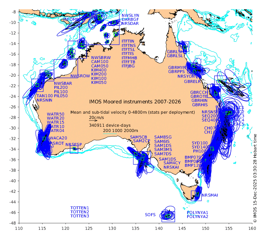 24 May 2018 Another re-read of the thredds server (including the Southern Ocean array for the first time) has netted 20 additional Shelf Array deployments and 15 Southern Ocean deployments. We have also implemented a new map-based way of navigating around the available data that also shows some basic statistics of the velocity data (such as mean, variance, tides, device-days).