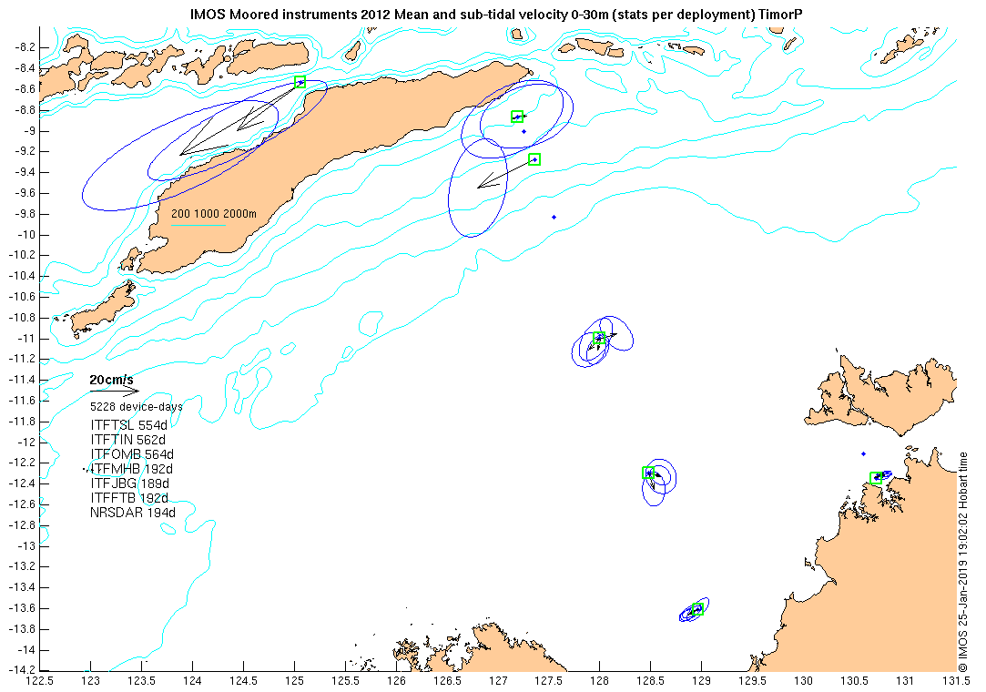 These maps show some basic analyses of the velocity data: mean and sub-tidal variance for several layers and time-windows, and tidal harmonics for the depth-average velocity using the whole record. Click through to see more detailed plots of the selected dataset or to download those data from the AODN thredds server.