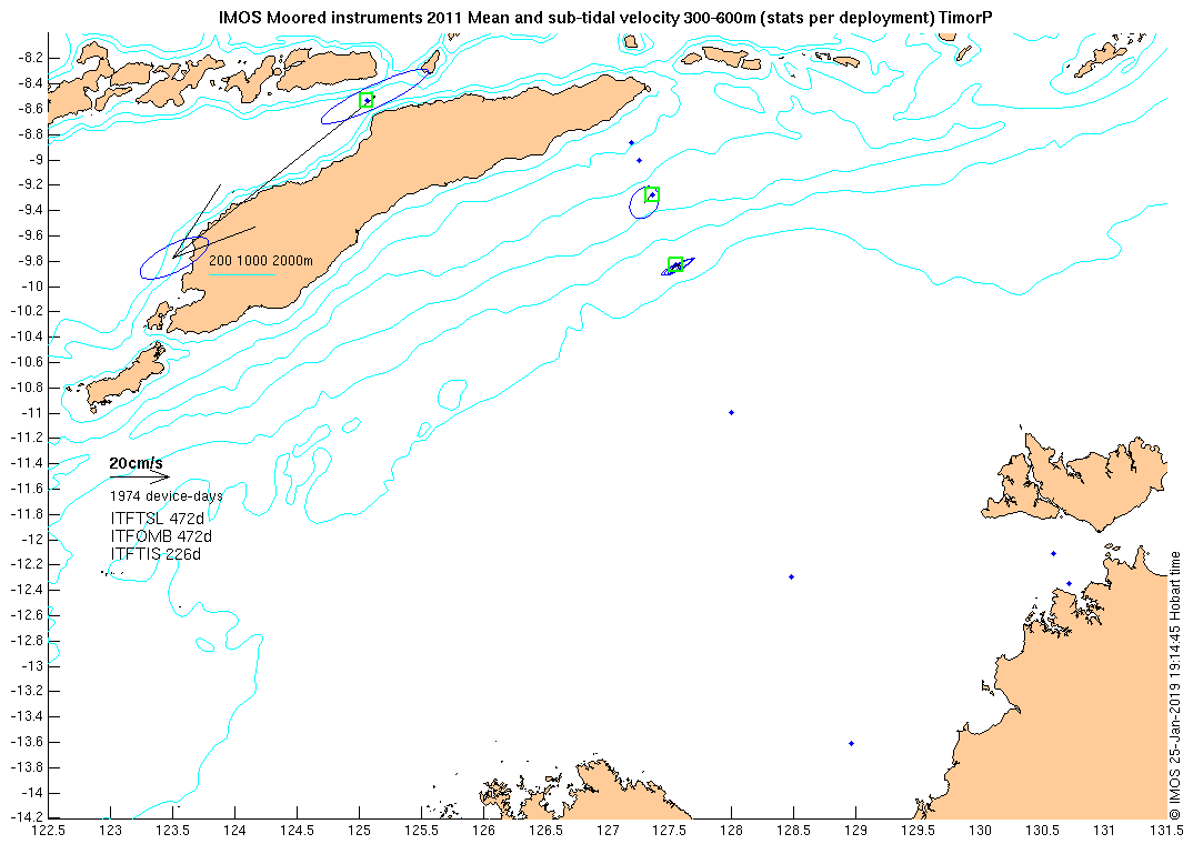 These maps show some basic analyses of the velocity data: mean and sub-tidal variance for several layers and time-windows, and tidal harmonics for the depth-average velocity using the whole record. Click through to see more detailed plots of the selected dataset or to download those data from the AODN thredds server.