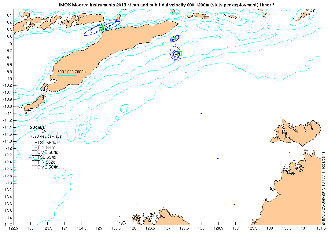These maps show some basic analyses of the velocity data: mean and sub-tidal variance for several layers and time-windows, and tidal harmonics for the depth-average velocity using the whole record. Click through to see more detailed plots of the selected dataset or to download those data from the AODN thredds server.
