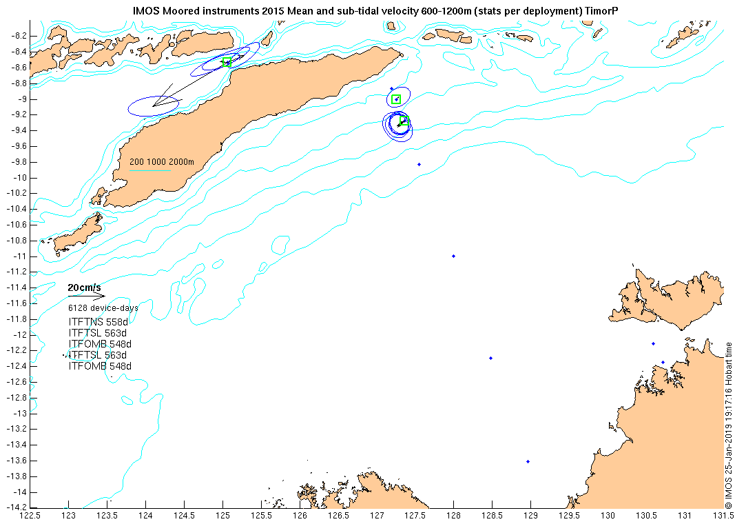 These maps show some basic analyses of the velocity data: mean and sub-tidal variance for several layers and time-windows, and tidal harmonics for the depth-average velocity using the whole record. Click through to see more detailed plots of the selected dataset or to download those data from the AODN thredds server.