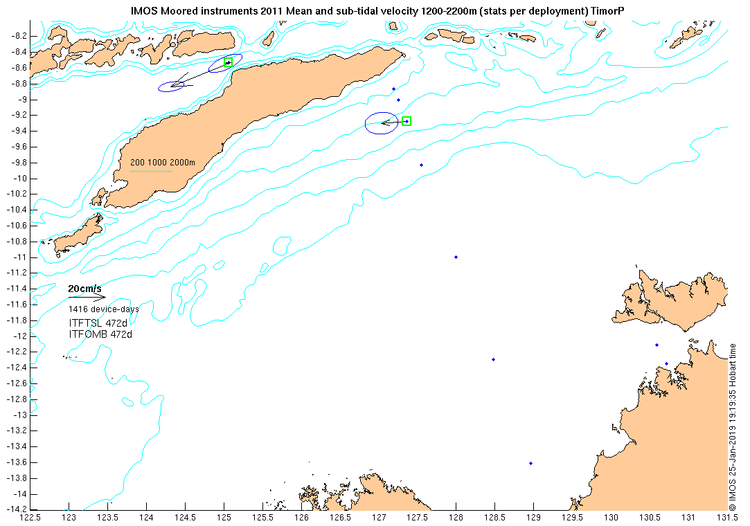 These maps show some basic analyses of the velocity data: mean and sub-tidal variance for several layers and time-windows, and tidal harmonics for the depth-average velocity using the whole record. Click through to see more detailed plots of the selected dataset or to download those data from the AODN thredds server.