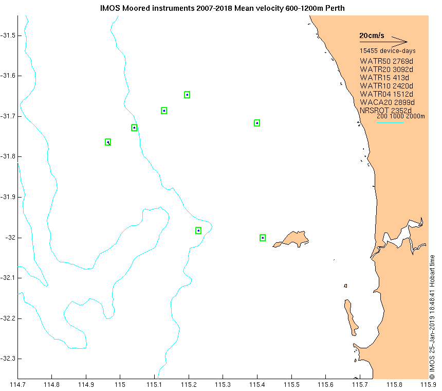 These maps show some basic analyses of the velocity data: mean and sub-tidal variance for several layers and time-windows, and tidal harmonics for the depth-average velocity using the whole record. Click through to see more detailed plots of the selected dataset or to download those data from the AODN thredds server.