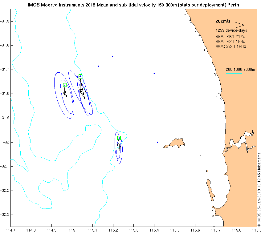 These maps show some basic analyses of the velocity data: mean and sub-tidal variance for several layers and time-windows, and tidal harmonics for the depth-average velocity using the whole record. Click through to see more detailed plots of the selected dataset or to download those data from the AODN thredds server.