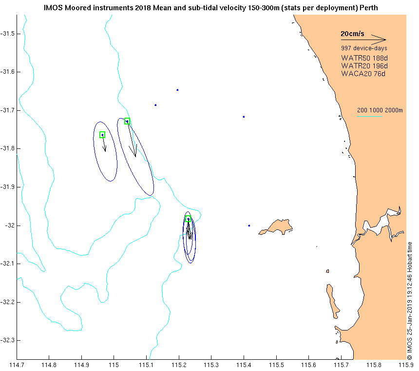 These maps show some basic analyses of the velocity data: mean and sub-tidal variance for several layers and time-windows, and tidal harmonics for the depth-average velocity using the whole record. Click through to see more detailed plots of the selected dataset or to download those data from the AODN thredds server.