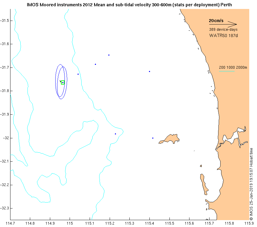 These maps show some basic analyses of the velocity data: mean and sub-tidal variance for several layers and time-windows, and tidal harmonics for the depth-average velocity using the whole record. Click through to see more detailed plots of the selected dataset or to download those data from the AODN thredds server.
