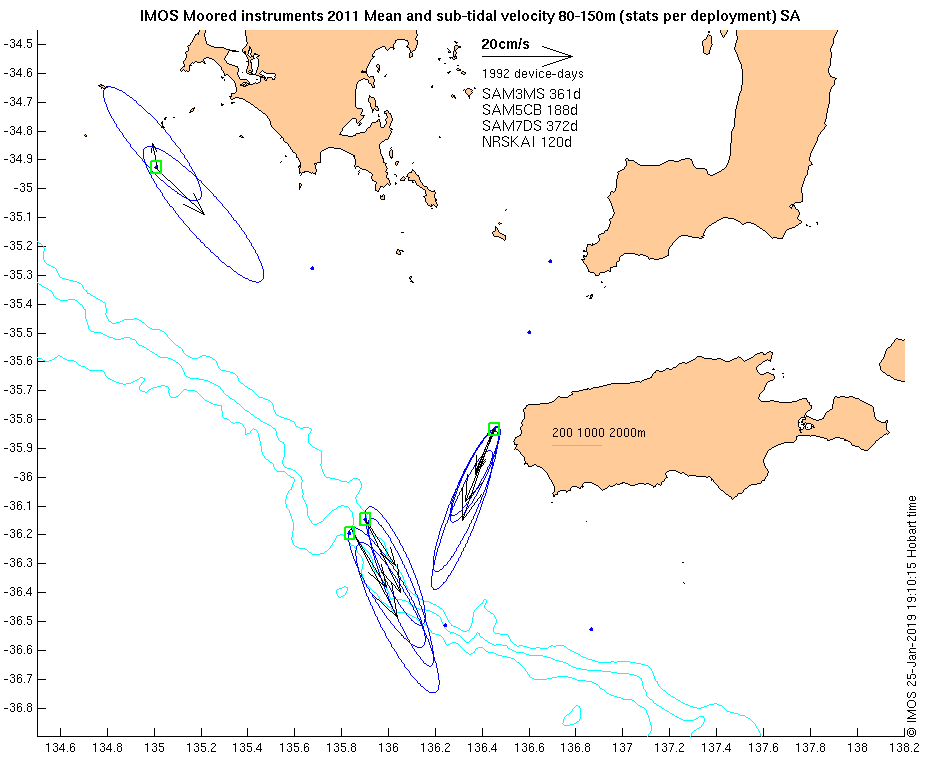 These maps show some basic analyses of the velocity data: mean and sub-tidal variance for several layers and time-windows, and tidal harmonics for the depth-average velocity using the whole record. Click through to see more detailed plots of the selected dataset or to download those data from the AODN thredds server.