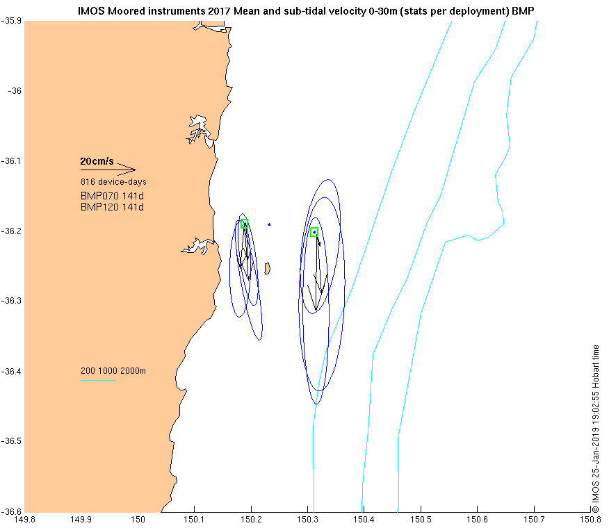 These maps show some basic analyses of the velocity data: mean and sub-tidal variance for several layers and time-windows, and tidal harmonics for the depth-average velocity using the whole record. Click through to see more detailed plots of the selected dataset or to download those data from the AODN thredds server.