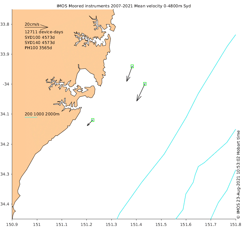 These maps show some basic analyses of the velocity data: mean and sub-tidal variance for several layers and time-windows, and tidal harmonics for the depth-average velocity using the whole record. Click through to see more detailed plots of the selected dataset or to download those data from the AODN thredds server.