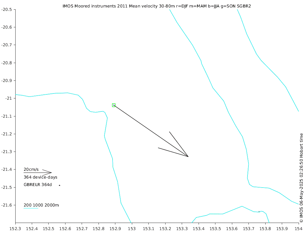 These maps show some basic analyses of the velocity data: mean (all-time in black and seasonal in colour) and sub-tidal variance for several layers and time-windows, and tidal harmonics for the depth-average velocity using the whole record. Click through to see more detailed plots of the selected dataset or to download those data from the AODN thredds server.