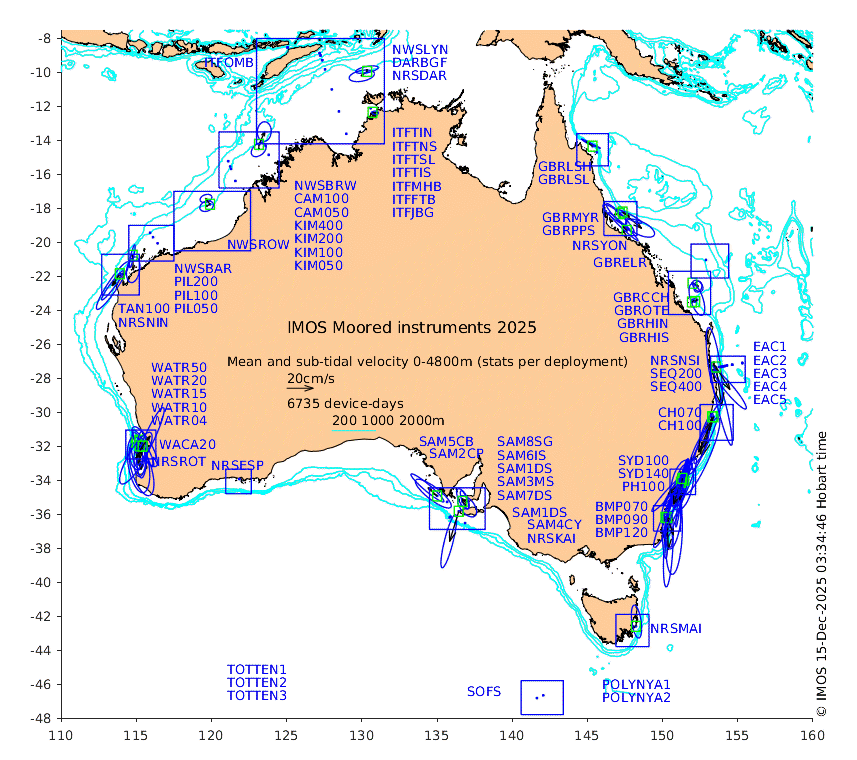 These maps show some basic analyses of the velocity data: mean (all-time in black and seasonal in colour) and sub-tidal variance for several layers and time-windows, and tidal harmonics for the depth-average velocity using the whole record. Click through to see more detailed plots of the selected dataset or to download those data from the AODN thredds server.