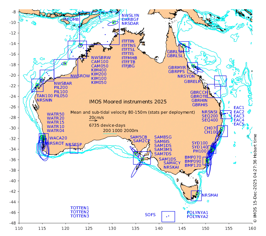 These maps show some basic analyses of the velocity data: mean (all-time in black and seasonal in colour) and sub-tidal variance for several layers and time-windows, and tidal harmonics for the depth-average velocity using the whole record. Click through to see more detailed plots of the selected dataset or to download those data from the AODN thredds server.