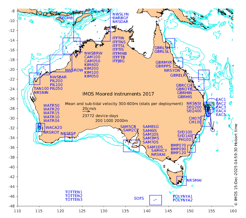 These maps show some basic analyses of the velocity data: mean (all-time in black and seasonal in colour) and sub-tidal variance for several layers and time-windows, and tidal harmonics for the depth-average velocity using the whole record. Click through to see more detailed plots of the selected dataset or to download those data from the AODN thredds server.