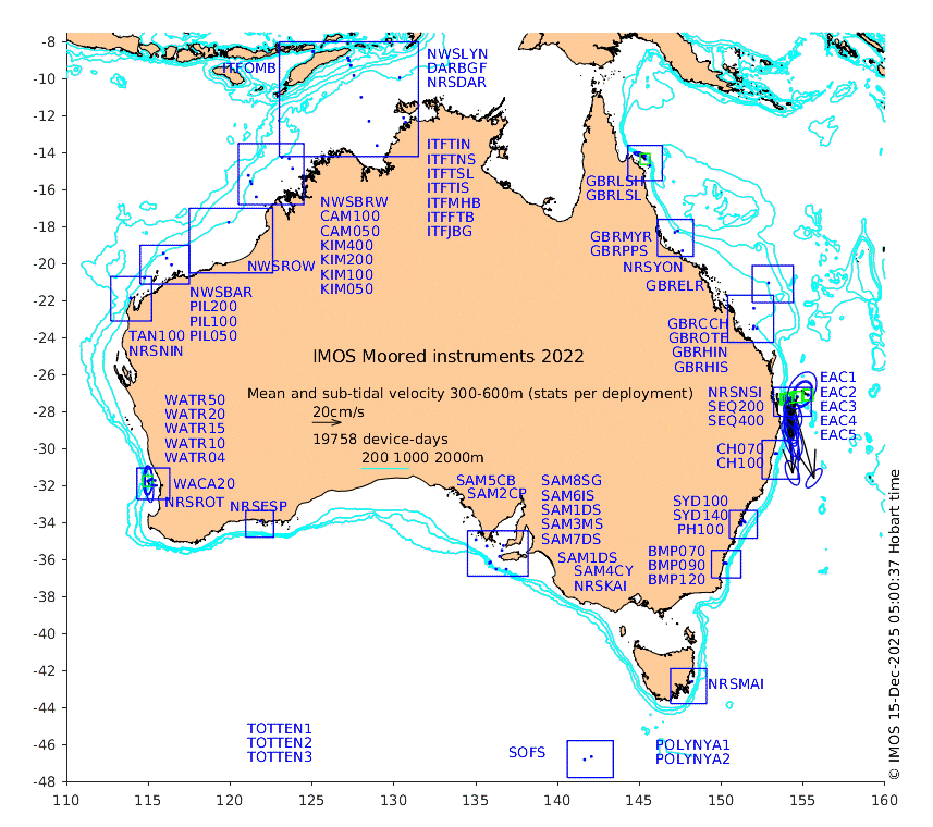 These maps show some basic analyses of the velocity data: mean (all-time in black and seasonal in colour) and sub-tidal variance for several layers and time-windows, and tidal harmonics for the depth-average velocity using the whole record. Click through to see more detailed plots of the selected dataset or to download those data from the AODN thredds server.