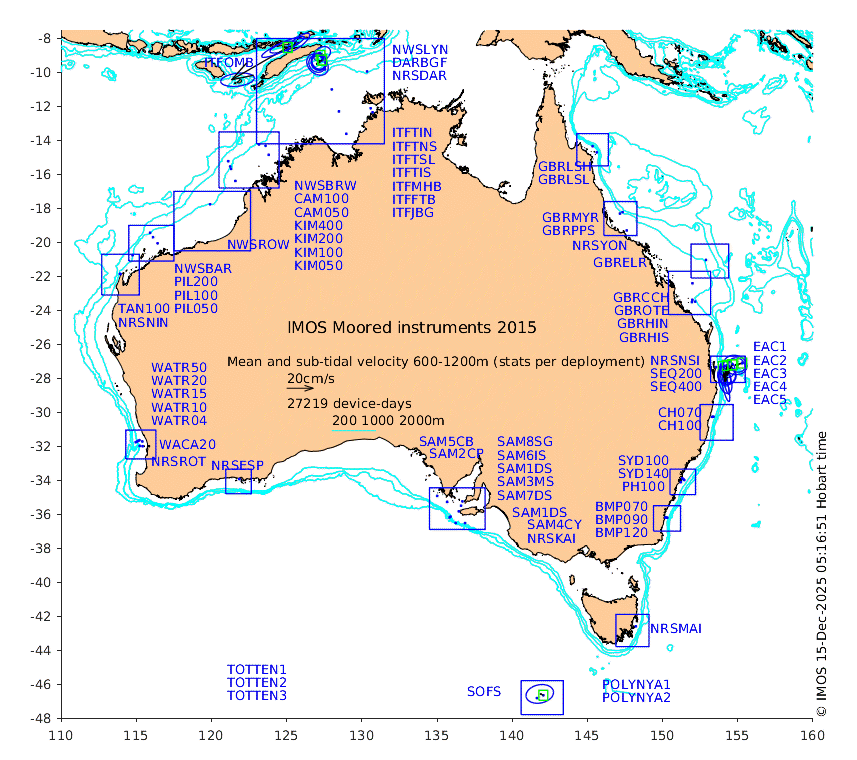 These maps show some basic analyses of the velocity data: mean (all-time in black and seasonal in colour) and sub-tidal variance for several layers and time-windows, and tidal harmonics for the depth-average velocity using the whole record. Click through to see more detailed plots of the selected dataset or to download those data from the AODN thredds server.