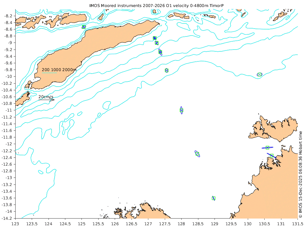 These maps show some basic analyses of the velocity data: mean (all-time in black and seasonal in colour) and sub-tidal variance for several layers and time-windows, and tidal harmonics for the depth-average velocity using the whole record. Click through to see more detailed plots of the selected dataset or to download those data from the AODN thredds server.