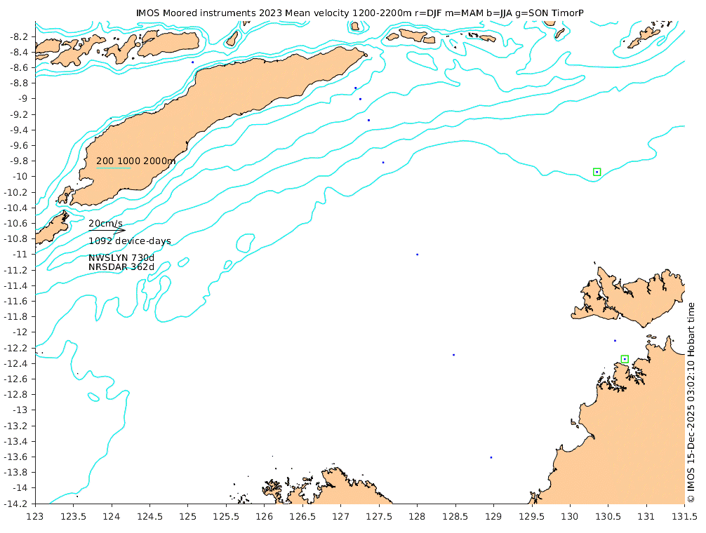 These maps show some basic analyses of the velocity data: mean (all-time in black and seasonal in colour) and sub-tidal variance for several layers and time-windows, and tidal harmonics for the depth-average velocity using the whole record. Click through to see more detailed plots of the selected dataset or to download those data from the AODN thredds server.