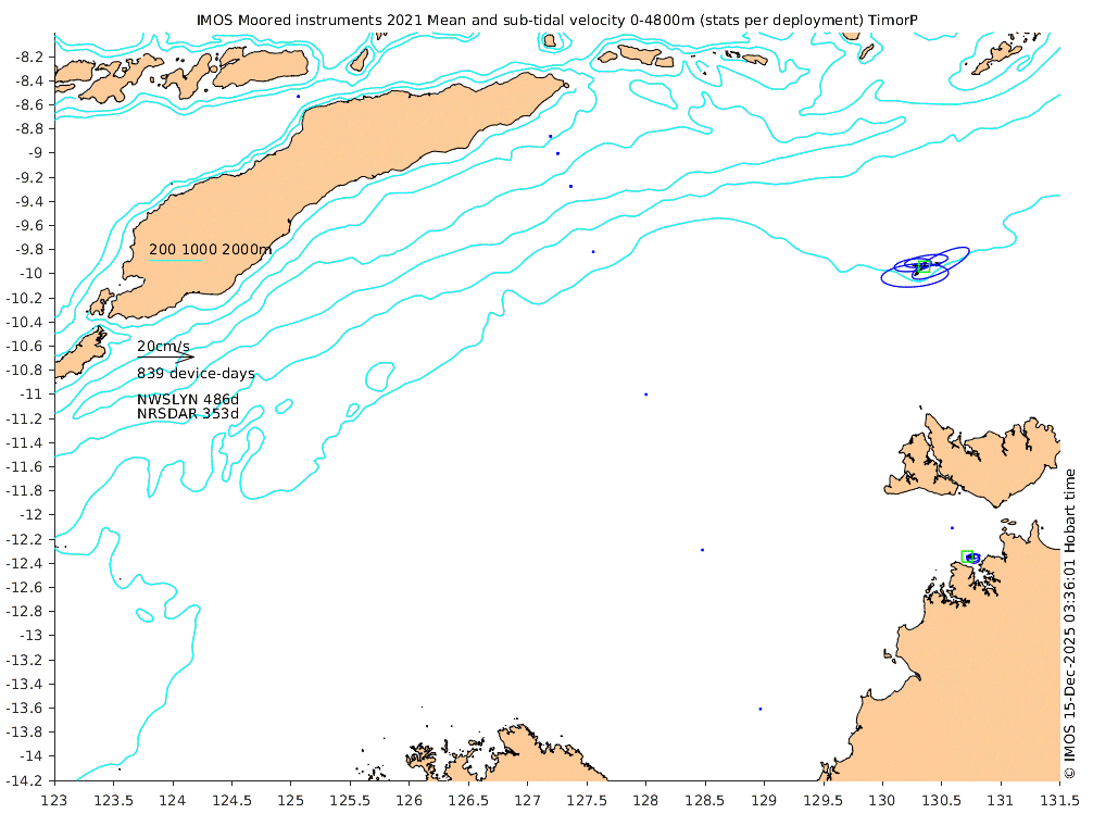 These maps show some basic analyses of the velocity data: mean (all-time in black and seasonal in colour) and sub-tidal variance for several layers and time-windows, and tidal harmonics for the depth-average velocity using the whole record. Click through to see more detailed plots of the selected dataset or to download those data from the AODN thredds server.