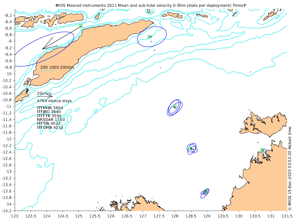 These maps show some basic analyses of the velocity data: mean (all-time in black and seasonal in colour) and sub-tidal variance for several layers and time-windows, and tidal harmonics for the depth-average velocity using the whole record. Click through to see more detailed plots of the selected dataset or to download those data from the AODN thredds server.