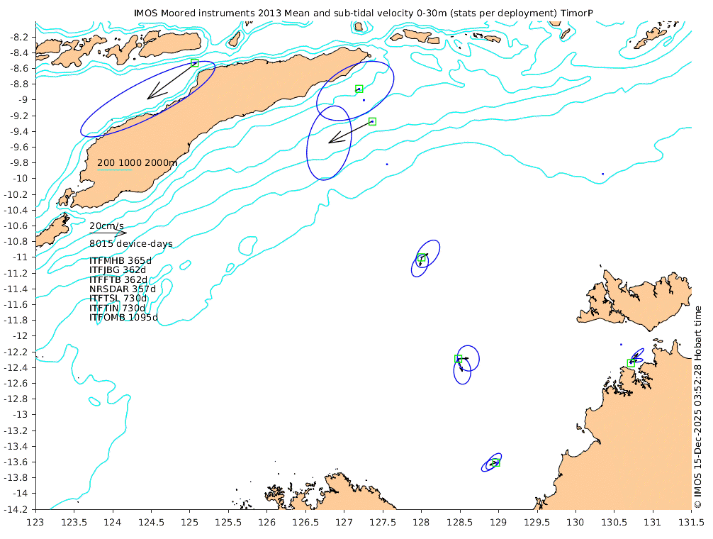 These maps show some basic analyses of the velocity data: mean (all-time in black and seasonal in colour) and sub-tidal variance for several layers and time-windows, and tidal harmonics for the depth-average velocity using the whole record. Click through to see more detailed plots of the selected dataset or to download those data from the AODN thredds server.