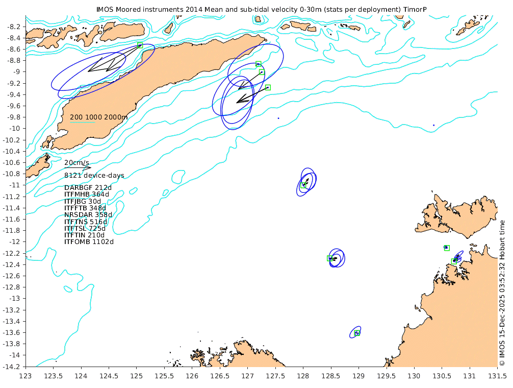 These maps show some basic analyses of the velocity data: mean (all-time in black and seasonal in colour) and sub-tidal variance for several layers and time-windows, and tidal harmonics for the depth-average velocity using the whole record. Click through to see more detailed plots of the selected dataset or to download those data from the AODN thredds server.